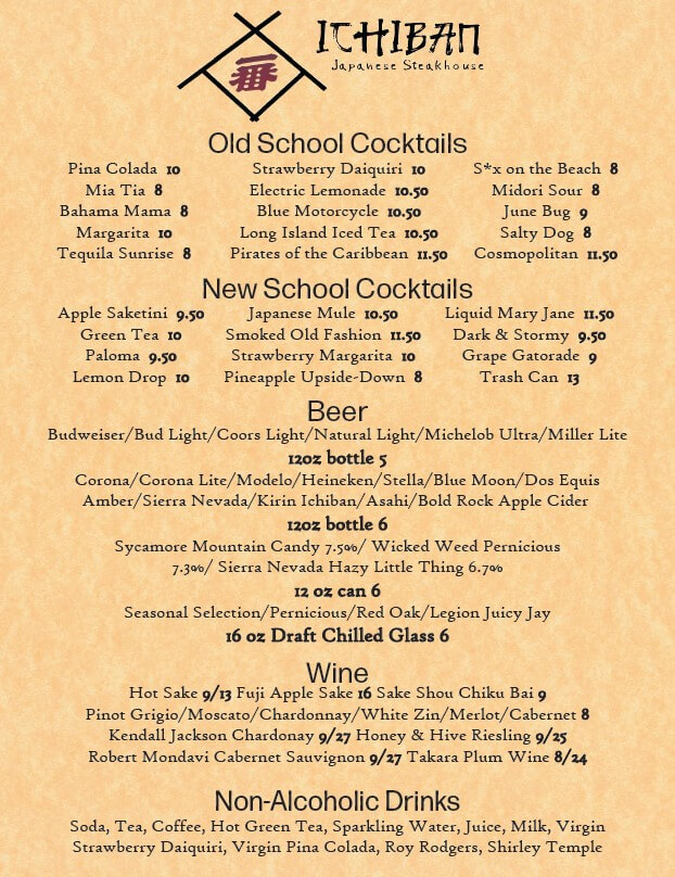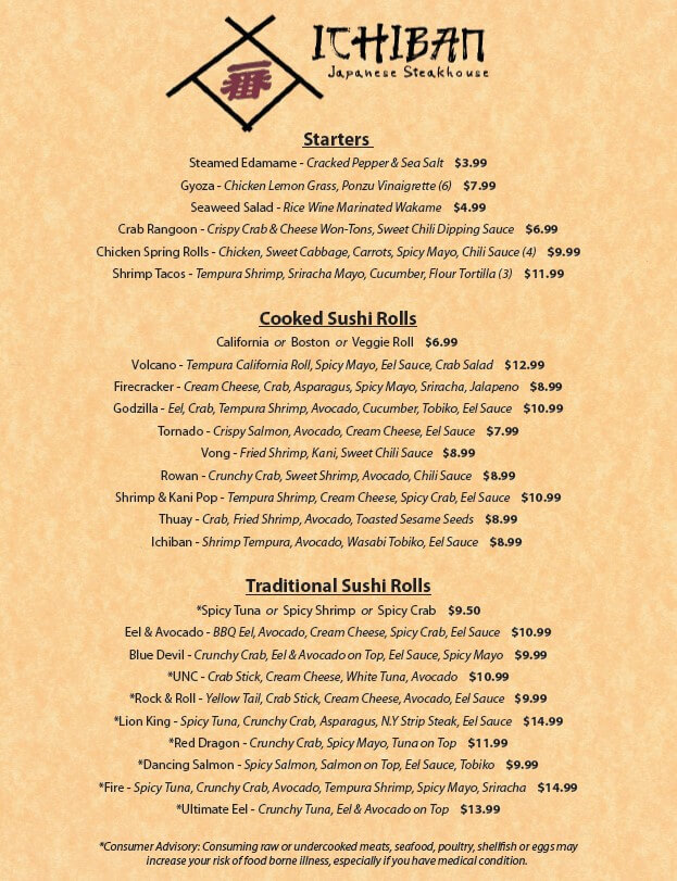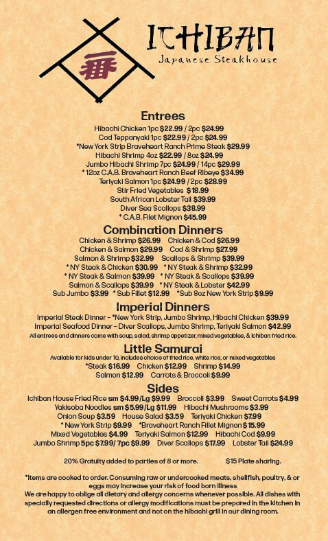 Our menu at Ichiban Japanese Seafood Steakhouse offers a journey through the vibrant tastes of Japanese cuisine. From sizzling hibachi dishes to fresh, handcrafted sushi and seafood specialties, every bite is a testament to our passion for culinary excellence. Explore the flavors, textures, and artistry that make Ichiban a standout dining destination in Salisbury, NC.